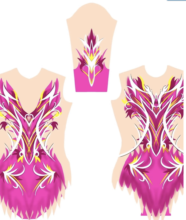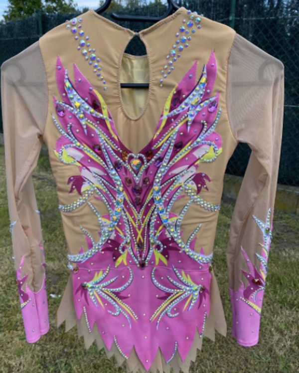 De acropakken zijn gemaakt van geprint lycra. Het huidskleurige stof is een mesh met voering zodat het niet doorschijnend is. Het huidskleur op mouwen is gewoon mesh zodat het wel doorschijnend is.